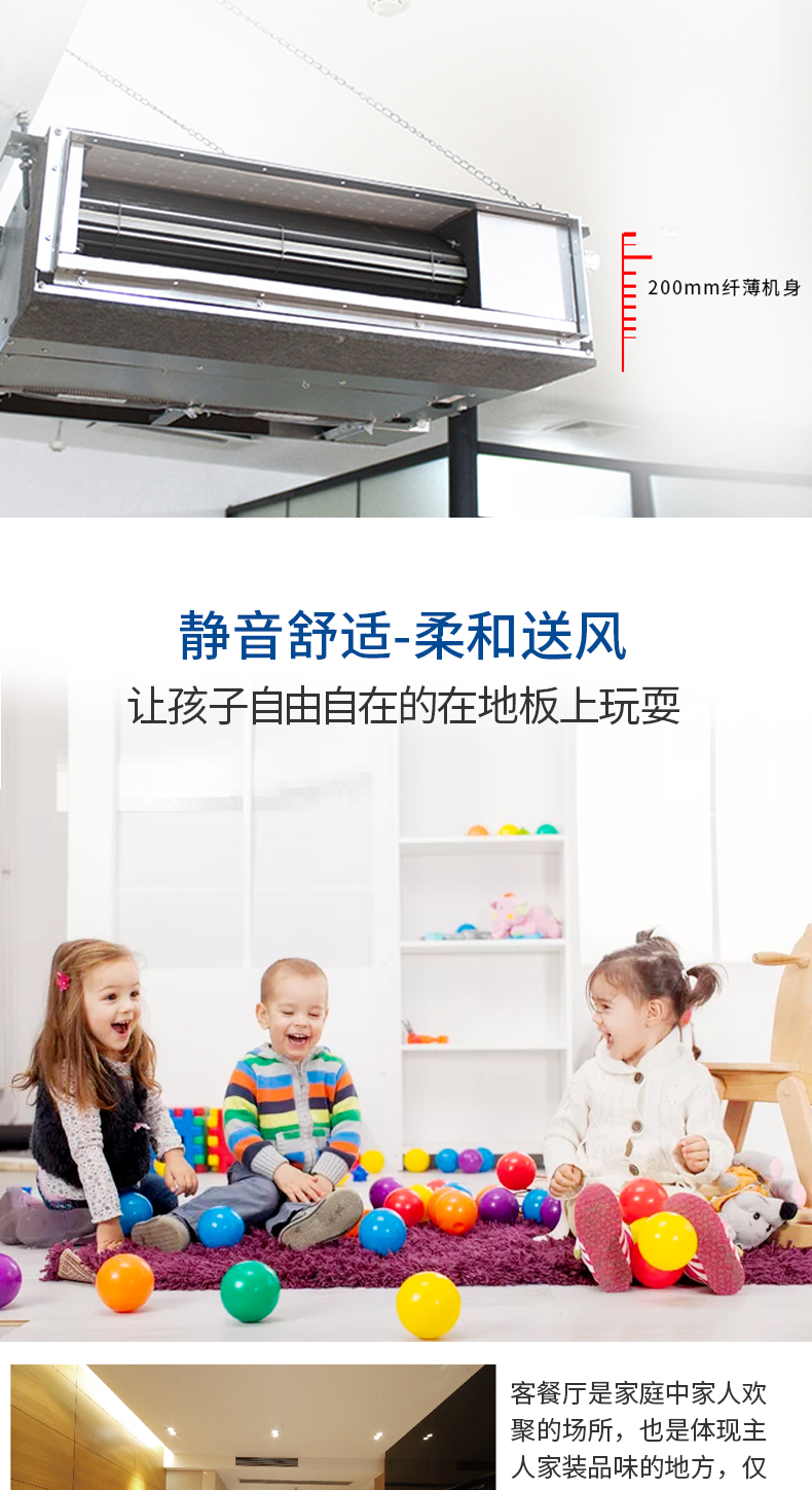 ● 客廳餐廳分別送風,氣流更均勻 ● 隱蔽式安裝,與客餐廳裝潢風格融合 ">