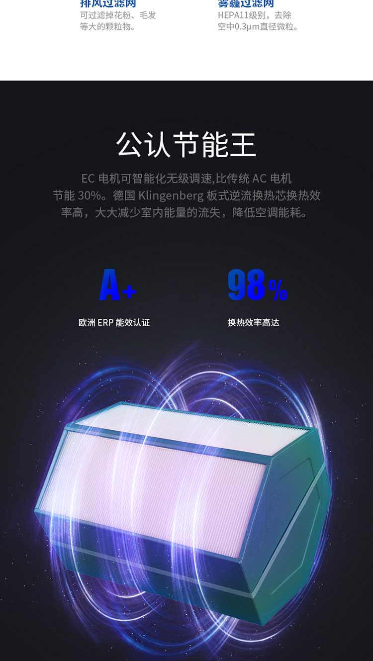 ● 風量高達415m3/h,滿足人體每小時30m3新鮮空氣的需求。